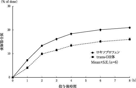 健康成人男性6例にロキソプロフェンナトリウム錠60mgを単回経口投与したとき、尿中への排泄は速やかで、尿中に排泄された大部分がロキソプロフェン又はtrans-OH体のグルクロン酸抱合体であった2)。