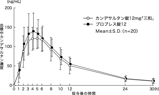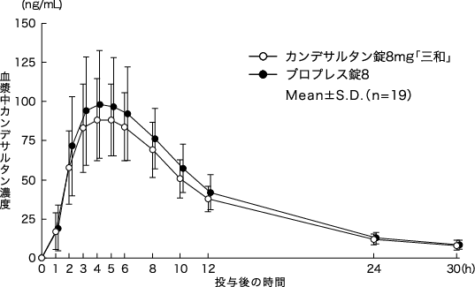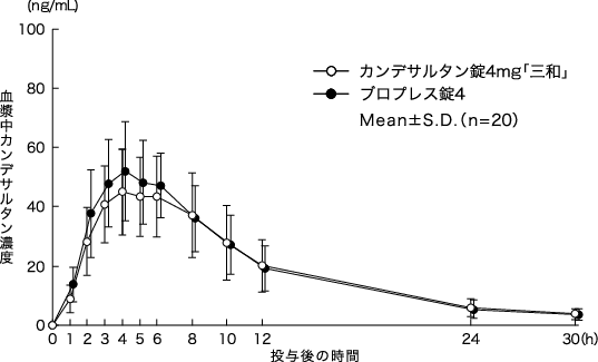 カンデサルタン錠2mg「三和」は、「含量が異なる経口固形製剤の生物学的同等性試験ガイドライン(平成24年2月29日薬食審査発0229第10号)に基づき、カンデサルタン錠4mg「三和」を標準製剤としたとき、溶出挙動が等しく、生物学的に同等とみなされた16)。
