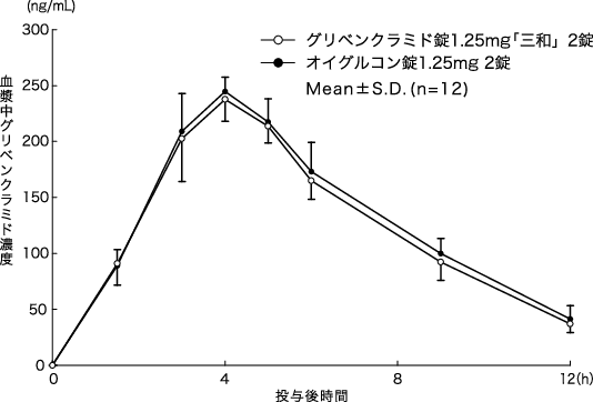 グリベンクラミド錠1.25mg「三和」とオイグルコン錠1.25mgそれぞれ2錠(グリベンクラミド2.5mg)を12匹の健康な雄性ビーグル犬にクロスオーバー法により空腹時単回経口投与し、血漿中グリベンクラミド濃度を測定した。得られた薬物動態パラメータ(AUC、Cmax)について統計解析を行った結果、両剤の生物学的同等性が確認された2)。