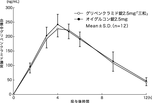 グリベンクラミド錠2.5mg「三和」とオイグルコン錠2.5mgそれぞれ1錠(グリベンクラミド2.5mg)を12匹の健康な雄性ビーグル犬にクロスオーバー法により空腹時単回経口投与し、血漿中グリベンクラミド濃度を測定した。得られた薬物動態パラメータ(AUC、Cmax)について統計解析を行った結果、両剤の生物学的同等性が確認された3)。