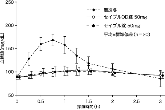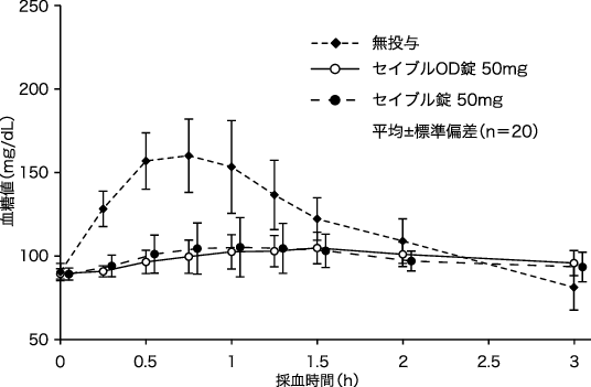 セイブルOD錠50mgを水なしまたは水と共に、セイブル錠50mgを水と共にそれぞれ1錠を20名の健康成人男性にクロスオーバー法により絶食単回経口投与し、75gスクロース負荷後3時間までの血糖値推移をコントロール期(無投与時)と比較した。得られたパラメータ(⊿AUC、⊿Cmax)について統計解析を行った結果、両剤の生物学的同等性が確認された26)。