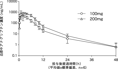 健康成人男性(6例)に本剤100又は200mgを空腹時単回経口投与したときの血漿中濃度推移及び薬物動態学的パラメータを以下に示す2)。