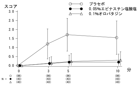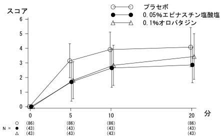 (2)無症状期のアレルギー性結膜炎患者(86例)を対象に、2群(片眼0.05%エピナスチン塩酸塩点眼液/他眼プラセボ点眼液、片眼0.1%オロパタジン点眼液/他眼プラセボ点眼液)に無作為に割付け、各眼に各点眼液を1回1滴点眼した。各点眼液点眼4時間後にスギ花粉抗原溶液を点眼し、症状について評価した結果、0.05%エピナスチン塩酸塩点眼液の有効性は0.1%オロパタジン点眼液と同程度であった。
