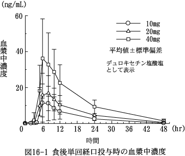 通常、成人には1日1回朝食後、デュロキセチンとして40mgを経口投与する。投与は1日20mgより開始し、1週間以上の間隔を空けて1日用量として20mgずつ増量する。なお、効果不十分な場合には、1日60mgまで増量することができる。
