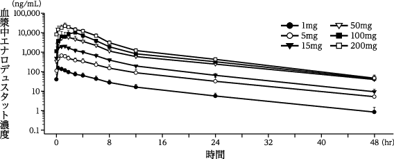 健康成人男性に本剤1,5,15,50,100及び200mg注)を空腹時単回経口投与した時のエナロデュスタットの薬物動態パラメータは,表16-1のとおりである9)。注)本剤の承認最高用量は,1日8mgである。