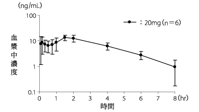 片頭痛を対象としたプラセボ対照二重盲検比較検証試験を実施した結果、主要評価項目である投与120分後の頭痛改善率は以下のとおりであり、本剤20mg群はプラセボ群に比し有意に高い改善率を示した。また、20mg群の頭痛改善率の推移は経時的に上昇し、投与15分後以降すべての評価時間(投与120分後まで)においてプラセボ群に比し有意に高い改善率を示した。
