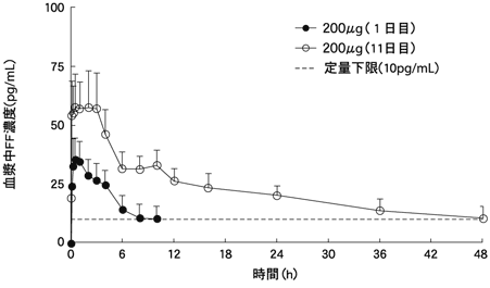 健康成人男性12例にフルチカゾンフランカルボン酸エステル(以下、FF) 200、400注)又は800注)μgを単回及び1日1回7日間吸入投与した時1) 、血漿中FF濃度は投与後2時間(中央値)までにCmaxに達し、t1/2は約24~33時間(幾何平均値)であった。血漿中FFの曝露量(AUC及びCmax)は200~800μg注)の投与量増加の割合にほぼ比例して増加した。また、血漿中FF濃度は反復投与5日目(9日目)までに定常状態に達した。FF 200μgを単回及び反復吸入投与(1日目:初回投与、5~11日目:1日1回7日間投与)した時の血漿中FFの濃度推移及び薬物動態パラメータは以下のとおりである。FF 800μg注)を単回吸入投与した時の血漿中FFのみかけのt1/2は約32時間であった。