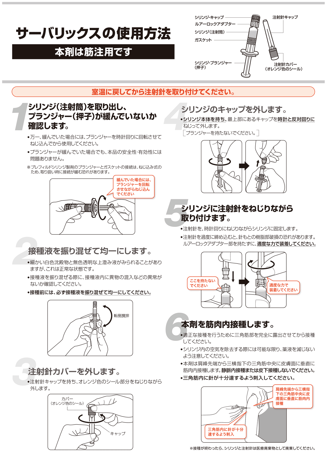 10歳以上の女性に、通常、1回0.5mLを0、1、6ヵ月後に3回、上腕の三角筋部に筋肉内接種する。