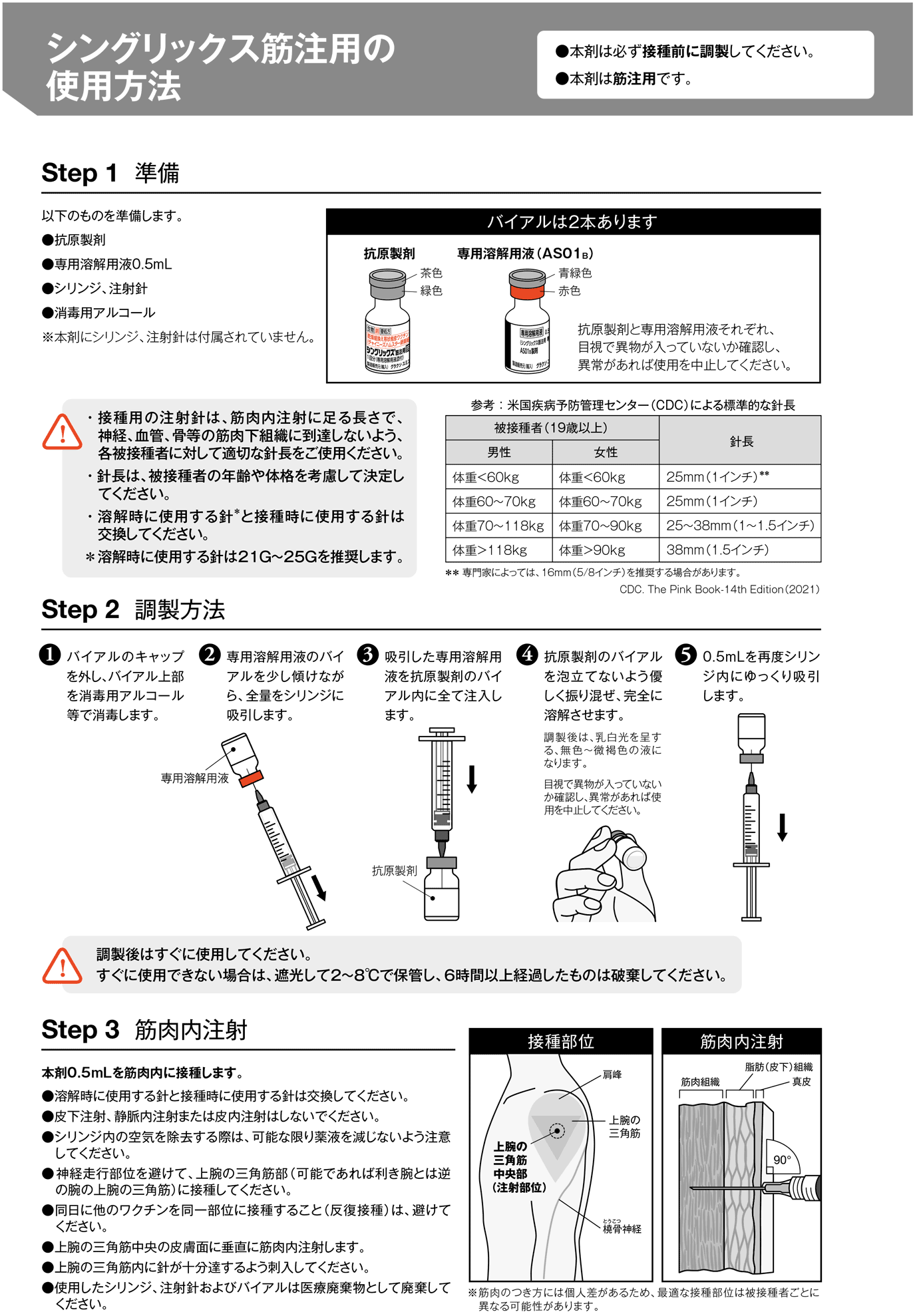 抗原製剤を専用溶解用液全量で溶解する。50歳以上の者には、0.5mLを2回、通常、2ヵ月の間隔をおいて、筋肉内に接種する。帯状疱疹に罹患するリスクが高いと考えられる18歳以上の者には、0.5mLを2回、通常、1~2ヵ月の間隔をおいて、筋肉内に接種する。
