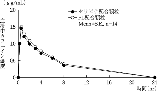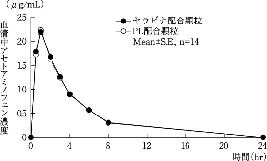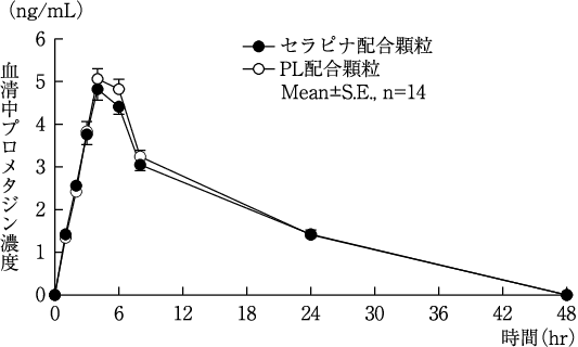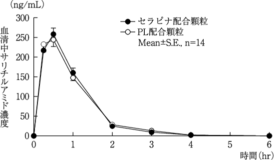 セラピナ配合顆粒とPL配合顆粒を、クロスオーバー法によりそれぞれ1g(サリチルアミド270mg、アセトアミノフェン150mg、無水カフェイン60mg、プロメタジンメチレンジサリチル酸塩13.5mg)健康成人男子に絶食単回経口投与して血清中サリチルアミド濃度、血清中アセトアミノフェン濃度、血清中カフェイン濃度、血清中プロメタジン濃度を測定し、得られた薬物動態パラメータ(AUC、Cmax)について統計解析を行った結果、両剤の生物学的同等性が確認された5)。