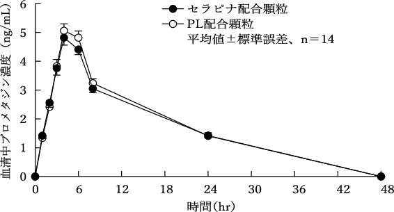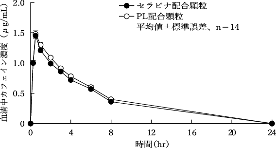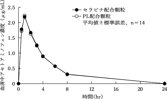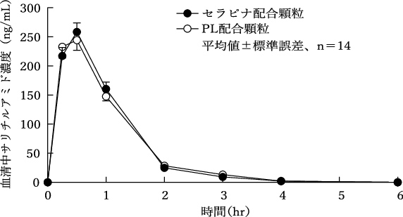 セラピナ配合顆粒とPL配合顆粒を、クロスオーバー法によりそれぞれ1g(サリチルアミド270mg、アセトアミノフェン150mg、無水カフェイン60mg、プロメタジンメチレンジサリチル酸塩13.5mg)健康成人男子に絶食単回経口投与して血清中サリチルアミド濃度、血清中アセトアミノフェン濃度、血清中カフェイン濃度、血清中プロメタジン濃度を測定し、得られた薬物動態パラメータ(AUC、Cmax)について統計解析を行った結果、両剤の生物学的同等性が確認された5)。