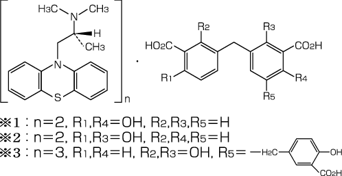 ※1:(2RS)-N,N-Dimethyl-1-(10H-phenothiazin-10-yl)propan-2-ylamine 5,5'-methylenedi(2-hydroxybenzoate)※2:(2RS)-N,N-Dimethyl-1-(10H-phenothiazin-10-yl)propan-2-ylamine 3,5'-methylenedi(2-hydroxybenzoate)※3:(2RS)-N,N-Dimethyl-1-(10H-phenothiazin-10-yl)propan-2-ylamine 3-(3-carboxy-4-hydroxybenzyl)-5,5'-methylenedi(2-hydroxybenzoate)