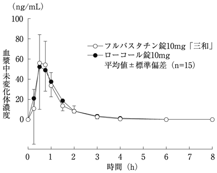 フルバスタチン錠10mg「三和」とローコール錠10mgを、クロスオーバー法によりそれぞれ1錠(フルバスタチンとして10mg)健康成人男性15例に絶食単回経口投与して血漿中未変化体濃度を測定し、得られた薬物動態パラメータ(AUC、Cmax)について90%信頼区間法にて統計解析を行った結果、log(0.80)~log(1.25)の範囲内であり、両剤の生物学的同等性が確認された1)。