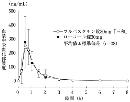 フルバスタチン錠30mg「三和」とローコール錠30mgを、クロスオーバー法によりそれぞれ1錠(フルバスタチンとして30mg)健康成人男性28例に絶食単回経口投与して血漿中未変化体濃度を測定し、得られた薬物動態パラメータ(AUC、Cmax)について90%信頼区間法にて統計解析を行った結果、log(0.80)~log(1.25)の範囲内であり、両剤の生物学的同等性が確認された1)。