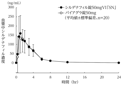 シルデナフィル錠50mgVI「SN」とバイアグラ錠50mgを、クロスオーバー法によりそれぞれ1錠(シルデナフィルとして50mg)健康成人男子20名に絶食時単回経口投与して血漿中未変化体濃度を測定した。得られた薬物動態パラメータ(AUC、Cmax)について90%信頼区間法にて統計解析を行った結果、log(0.80)~log(1.25)の範囲内であり、両製剤の生物学的同等性が確認された12) 。