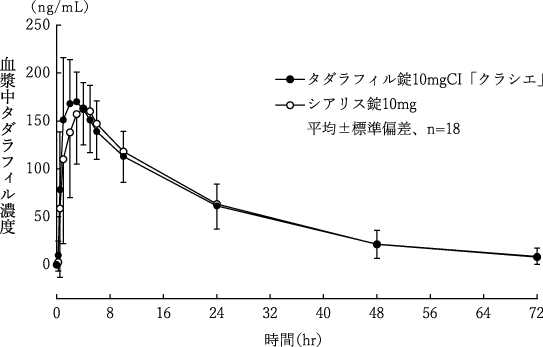 日本人健康成人36例にタダラフィル5、10、20、40mg注3)を単回経口投与したときのタダラフィルの血漿中濃度は、投与0.5~4時間(Tmaxの中央値、3時間)の間にピークに達した後、消失した。消失半減期は約14~15時間であった20)。