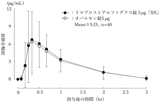 リマプロストアルファデクス錠5μg「SN」とオパルモン錠5μgを、クロスオーバー法によりそれぞれ6錠(リマプロストとして30μg注1))健康成人男子に絶食単回経口投与して血漿中リマプロスト濃度を測定し、得られた薬物動態パラメータ(AUC、Cmax)について90%信頼区間法にて統計解析を行った結果、log(0.80)~log(1.25)の範囲内であり、両剤の生物学的同等性が確認された4)。注1)本剤の承認された用法及び用量は、閉塞性血栓血管炎に伴う潰瘍、疼痛および冷感などの虚血性諸症状の改善にはリマプロストとして1日30μgを3回に分けて、後天性の腰部脊柱管狭窄症(SLR試験正常で、両側性の間欠跛行を呈する患者)に伴う自覚症状(下肢疼痛、下肢しびれ)および歩行能力の改善にはリマプロストとして1日15μgを3回に分けて経口投与である。