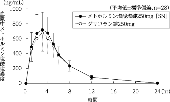 メトホルミン塩酸塩錠250mg「SN」とグリコラン錠250mgを、クロスオーバー法によりそれぞれ1錠(メトホルミン塩酸塩として250mg)健康成人男子に絶食単回経口投与して血漿中メトホルミン塩酸塩濃度を測定し、得られた薬物動態パラメータ(AUC、Cmax)について90%信頼区間法にて統計解析を行った結果、log(0.80)~log(1.25)の範囲内であり、両剤の生物学的同等性が確認された2)。