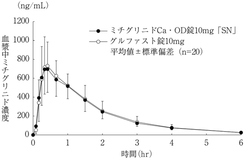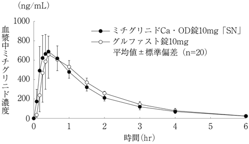 ミチグリニドCa・OD錠5mg「SN」は、「含量が異なる経口固形製剤の生物学的同等性試験ガイドライン(平成24年2月29日薬食審査発0229第10号)」に基づき、ミチグリニドCa・OD錠10mg「SN」を標準製剤としたとき、溶出挙動が等しく、生物学的に同等とみなされた4)。注1)本剤の承認されている用法及び用量は「通常、成人にはミチグリニドカルシウム水和物として1回10mgを1日3回毎食直前に経口投与する。なお、患者の状態に応じて適宜増減する。」である。注2)1例において、AUC0-5を除く薬物動態パラメータは算出不能であった。