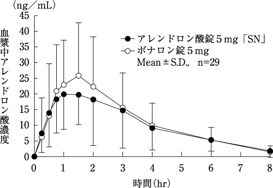 アレンドロン酸錠5mg「SN」とボナロン錠5mgを、クロスオーバー法によりそれぞれ7錠(アレンドロン酸として35mg)健康成人男子に絶食単回経口投与して血漿中アレンドロン酸濃度を測定し、得られた薬物動態パラメータ(AUC、Cmax)について90%信頼区間法にて統計解析を行った結果、log(0.80)~log(1.25)の範囲内であり、両剤の生物学的同等性が確認された3)。