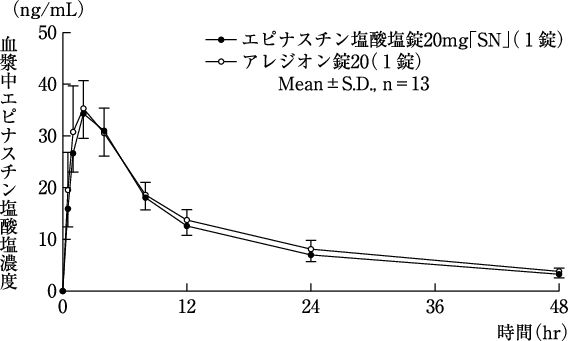 エピナスチン塩酸塩錠20mg「SN」とアレジオン錠20を、クロスオーバー法によりそれぞれ1錠(エピナスチン塩酸塩20mg)健康成人男子に絶食単回経口投与して血漿中未変化体濃度を測定し、得られた薬物動態パラメータ(AUC、Cmax)について90%信頼区間法にて統計解析を行った結果、log(0.80)~log(1.25)の範囲内であり、両剤の生物学的同等性が確認された2)。