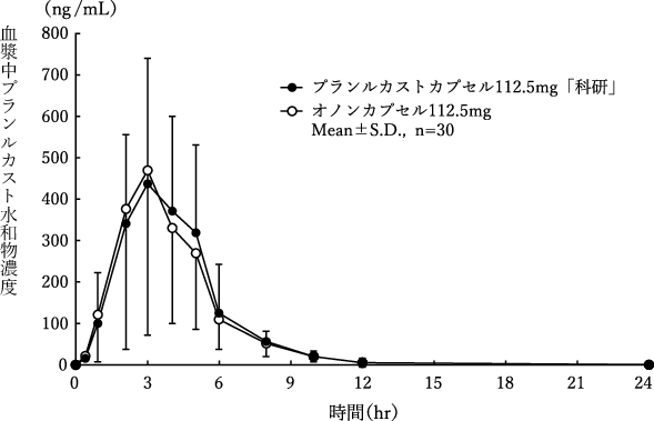 プランルカストカプセル112.5mg「科研」とオノンカプセル112.5mgを、クロスオーバー法によりそれぞれ1カプセル(プランルカスト水和物として112.5mg)健康成人男子に絶食単回経口投与して血漿中プランルカスト水和物濃度を測定し、得られた薬物動態パラメータ(AUC、Cmax)について90%信頼区間法にて統計解析を行った結果、log(0.80)~log(1.25)の範囲内であり、両剤の生物学的同等性が確認された2)。