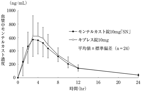 モンテルカスト錠10mg「SN」とキプレス錠10mgを、クロスオーバー法によりそれぞれ1錠(モンテルカストとして10mg)健康成人男子に絶食単回経口投与して血漿中モンテルカスト濃度を測定し、得られた薬物動態パラメータ(AUC、Cmax)について90%信頼区間法にて統計解析を行った結果、log(0.80)~log(1.25)の範囲内であり、両剤の生物学的同等性が確認された4)。
