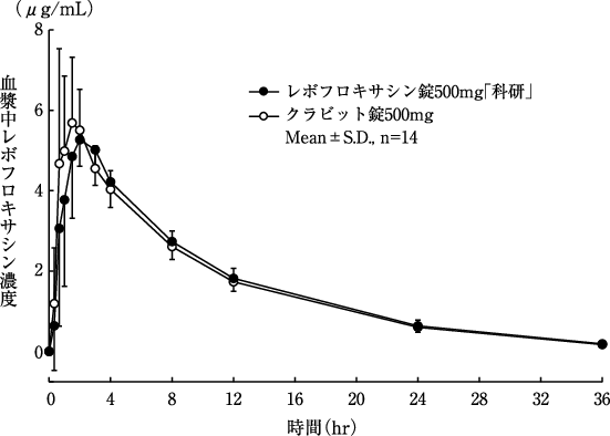 健康成人にレボフロキサシン500mgを単回経口投与(40例)した場合又は60分間で単回点滴静注(8例)した場合、薬物動態パラメータは、次のとおりであった5)。