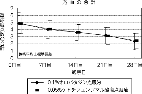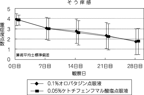 アレルギー性結膜炎患者(247例)を対象に、0.1%オロパタジン点眼液又は0.05%ケトチフェンフマル酸塩点眼液を両眼に1回2滴、1日4回(朝、昼、夕、就寝前)28日間点眼投与したところ、そう痒感及び充血の重症度点数において、0.1%オロパタジン点眼液は0.05%ケトチフェンフマル酸塩点眼液に劣らない有効性を示した。