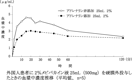 患者に2%メピバカイン液25mL(メピバカイン塩酸塩として500mg)単独あるいはアドレナリンを添加(1:200,000)して硬膜外投与したとき、単独群での血漿中濃度は、15分後に最高濃度(4.65μg/mL)を示したが、アドレナリン添加群では最高濃度の低下(36%)及び最高濃度到達時間の遅延が認められた1)(外国人データ)。