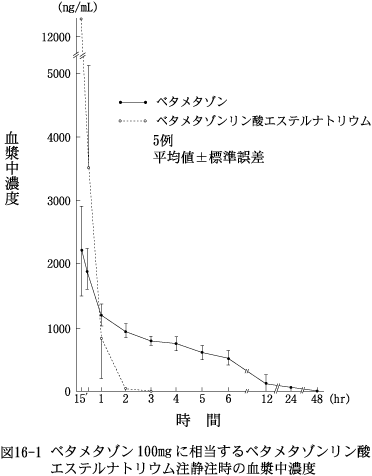 脳外科手術患者5例にベタメタゾン100mgに相当するベタメタゾンリン酸エステルナトリウム注を静脈内注射したときのベタメタゾンリン酸エステルナトリウムは、投与直後に高い血漿中濃度を示したが、その後急速に減少し、1時間後には690±480ng/mL(平均値±標準誤差)、2時間後には40±40ng/mLであった。一方、遊離型ベタメタゾンの血漿中濃度は極めて徐々に減少し、1時間後には1230±160ng/mL、2時間後には940±110ng/mL、3時間後には790±40ng/mLであった2)(測定法:HPLC)。