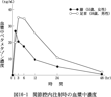 関節リウマチ患者の膝又は足首、各1例にベタメタゾン酢酸エステル4mg及びベタメタゾンリン酸エステルナトリウム1.32mg含有水性懸濁注射液を単回関節腔内注射したときの血漿中ベタメタゾン濃度を図16-1に示す。関節腔内注射後1~3時間で最高に達し、6時間以後次第に下降するが、48時間後にも血漿中に存在した2)(測定法:RIA)。
