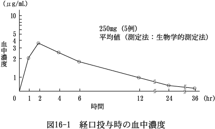 健康女性5例にメトロニダゾール内服錠250mgを単回経口投与したときの血中濃度を図16-1に示す。血中濃度は2時間後に最高値を示した6)。