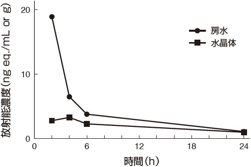ウサギに0.005%3H-ピレノキシン点眼液を1回50μL、5分間隔で7回点眼したとき、放射能濃度は房水では投与後2時間に最高濃度18.9ng eq./mL、水晶体では投与後4時間に最高濃度3.3ng eq./gを示した。