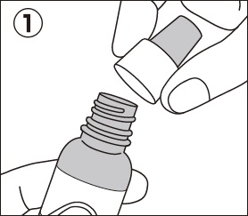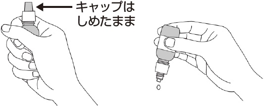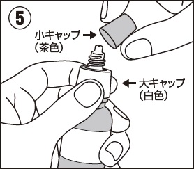 点眼する時は、白色の大キャップはそのままにして茶色の小キャップのみをはずし、容器の先端が目に触れないように注意して点眼する。(誤って白色の大キャップをはずしますと、液がこぼれますので、ご注意ください。)
