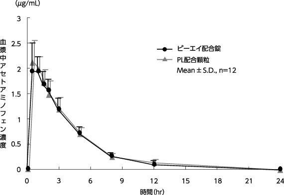 ピーエイ配合錠とPL配合顆粒を、クロスオーバー法によりピーエイ配合錠は2錠、PL配合顆粒は1g(サリチルアミド270mg・アセトアミノフェン150mg・無水カフェイン60mg・プロメタジンメチレンジサリチル酸塩13.5mg)健康成人男子に絶食単回経口投与して各血漿中未変化体濃度を測定し、得られた薬物動態パラメータ(AUC、Cmax)について統計解析を行った結果、両剤の生物学的同等性が確認された7)。