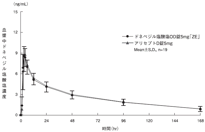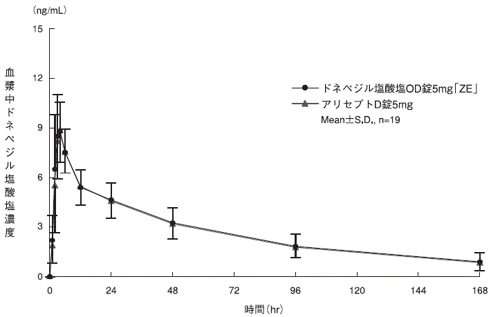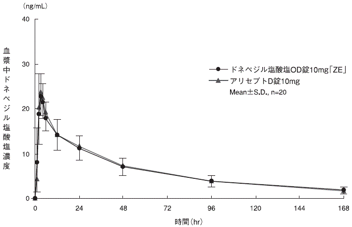 ドネペジル塩酸塩OD錠5mg「ZE」とアリセプトD錠5mgを、クロスオーバー法によりそれぞれ1錠(ドネペジル塩酸塩として5mg)健康成人男子に絶食後、水あり及び水なし単回経口投与して血漿中未変化体濃度を測定し、得られた薬物動態パラメータ(AUC、Cmax)について90%信頼区間法にて統計解析を行った結果、log(0.80)~log(1.25)の範囲内であり、両剤の生物学的同等性が確認された3)。