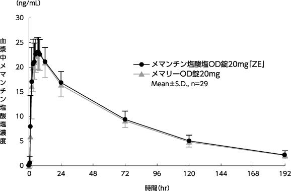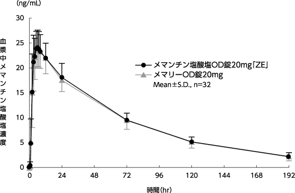 健康成人にメマンチン塩酸塩OD錠20mg(水なしで服用又は水で服用)又はメマンチン塩酸塩錠20mg(水で服用)をクロスオーバー法で空腹時単回経口投与したとき、いずれの場合も両製剤の血漿中濃度推移及び薬物動態パラメータは同様であった。メマンチン塩酸塩OD錠20mgは水なしで服用又は水で服用した場合のいずれも、メマンチン塩酸塩錠20mg(水で服用)と生物学的に同等であることが確認された3)。