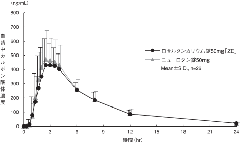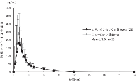 ロサルタンカリウム錠50mg「ZE」とニューロタン錠50mgを、クロスオーバー法によりそれぞれ1錠(ロサルタンカリウムとして50mg)健康成人男子に絶食単回経口投与して血漿中未変化体及び活性代謝物(カルボン酸体)濃度を測定し、得られた薬物動態パラメータ(AUC、Cmax)について統計解析を行った結果、両剤の生物学的同等性が確認された7)。