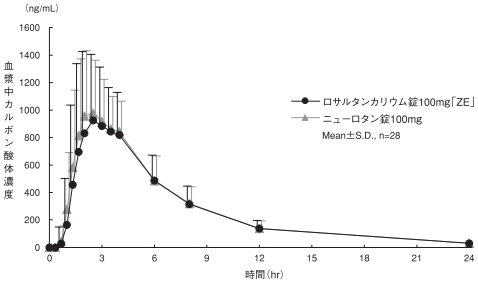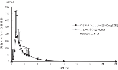 ロサルタンカリウム錠100mg「ZE」とニューロタン錠100mgを、クロスオーバー法によりそれぞれ1錠(ロサルタンカリウムとして100mg)健康成人男子に絶食単回経口投与して血漿中未変化体及び活性代謝物(カルボン酸体)濃度を測定し、得られた薬物動態パラメータ(AUC、Cmax)について統計解析を行った結果、両剤の生物学的同等性が確認された8)。