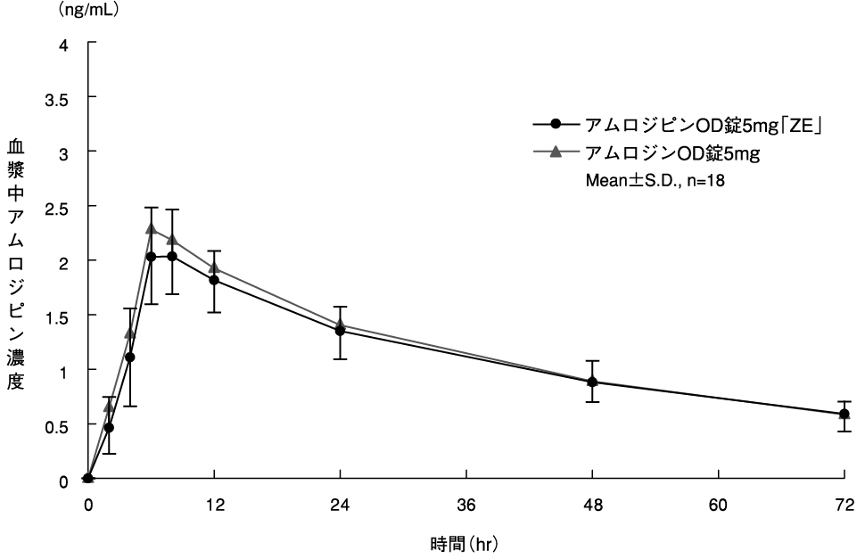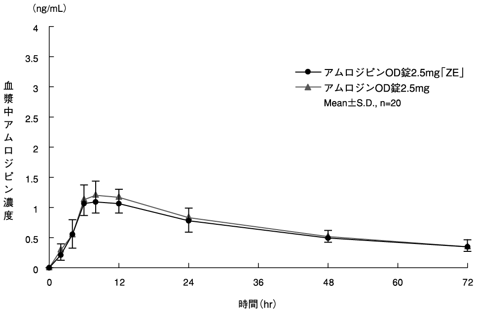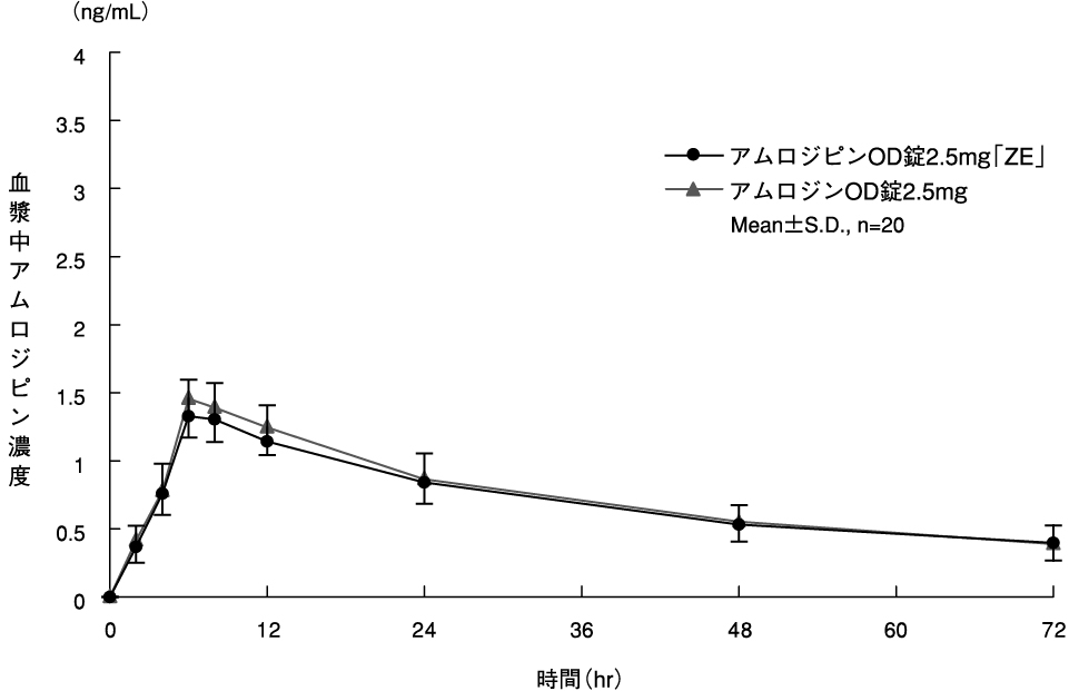 アムロジピンOD錠2.5mg「ZE」とアムロジンOD錠2.5mgを、クロスオーバー法によりそれぞれ1錠(アムロジピンとして2.5mg)健康成人男子に絶食後、水あり及び水なし単回経口投与して血漿中未変化体濃度を測定し、得られた薬物動態パラメータ(AUC、Cmax)について90%信頼区間法にて統計解析を行った結果、log(0.80)~log(1.25)の範囲内であり、両剤の生物学的同等性が確認された8)。