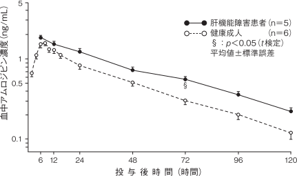 成人肝硬変患者(Child A、Bクラス)5例にアムロジピンとして2.5mgを単回経口投与した場合の薬物動態は図及び表のとおりであった。健康成人に比較して、投与72時間後の血中濃度が有意に上昇し、t1/2、AUCはやや高値を示したが有意差は認められなかった13)。