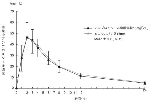 アンブロキソール塩酸塩錠15mg「ZE」とムコソルバン錠15mgを、クロスオーバー法によりそれぞれ2錠(アンブロキソール塩酸塩として30mg注1))健康成人男子に絶食単回経口投与して血漿中未変化体濃度を測定し、得られた薬物動態パラメータ(AUC、Cmax)について統計解析を行った結果、両剤の生物学的同等性が確認された1)。