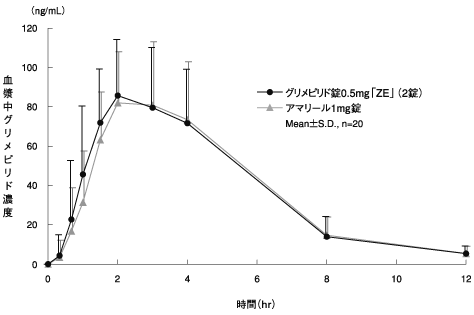 グリメピリド錠0.5mg「ZE」2錠とアマリール1mg錠1錠(グリメピリドとして1mg)を、クロスオーバー法により健康成人男子に食後30分後単回経口投与して血漿中未変化体濃度を測定し、得られた薬物動態パラメータ(AUC、Cmax)について90%信頼区間法にて統計解析を行った結果、log(0.80)〜log(1.25)の範囲内であり、両剤の生物学的同等性が確認された4)。