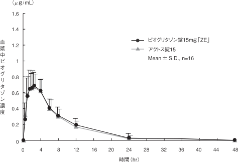 ピオグリタゾン錠15mg「ZE」とアクトス錠15を、クロスオーバー法によりそれぞれ1錠(ピオグリタゾンとして15mg)健康成人男子に絶食単回経口投与して血漿中未変化体濃度を測定し、得られた薬物動態パラメータ(AUC、Cmax)について90%信頼区間法にて統計解析を行った結果、log(0.80)~log(1.25)の範囲内であり、両剤の生物学的同等性が確認された10)。