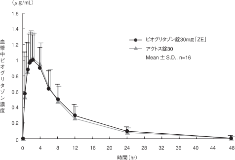 ピオグリタゾン錠30mg「ZE」とアクトス錠30を、クロスオーバー法によりそれぞれ1錠(ピオグリタゾンとして30mg)健康成人男子に絶食単回経口投与して血漿中未変化体濃度を測定し、得られた薬物動態パラメータ(AUC、Cmax)について90%信頼区間法にて統計解析を行った結果、log(0.80)~log(1.25)の範囲内であり、両剤の生物学的同等性が確認された11)。