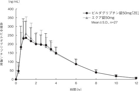 ビルダグリプチン錠50mg「ZE」とエクア錠50mgを、クロスオーバー法によりそれぞれ1錠(ビルダグリプチンとして50mg)健康成人男子に絶食単回経口投与して血漿中未変化体濃度を測定し、得られた薬物動態パラメータ(AUC、Cmax)について90%信頼区間法にて統計解析を行った結果、log(0.80)~log(1.25)の範囲内であり、両剤の生物学的同等性が確認された4)。