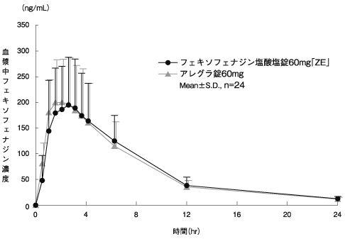 フェキソフェナジン塩酸塩錠60mg「ZE」とアレグラ錠60mgを、クロスオーバー法によりそれぞれ1錠(フェキソフェナジン塩酸塩として60mg)健康成人男子に絶食単回経口投与して血漿中未変化体濃度を測定し、得られた薬物動態パラメータ(AUC、Cmax)について90%信頼区間法にて統計解析を行った結果、log(0.80)~log(1.25)の範囲内であり、両剤の生物学的同等性が確認された4)。