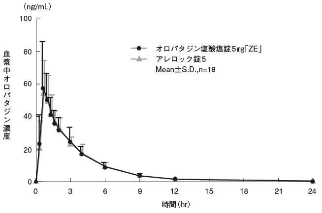 オロパタジン塩酸塩錠5mg「ZE」とアレロック錠5を、クロスオーバー法によりそれぞれ1錠(オロパタジン塩酸塩として5mg)健康成人男子に絶食単回経口投与して血漿中未変化体濃度を測定し、得られた薬物動態パラメータ(AUC、Cmax)について90%信頼区間法にて統計解析を行った結果、log(0.80)~log(1.25)の範囲内であり、両剤の生物学的同等性が確認された3)。