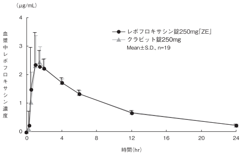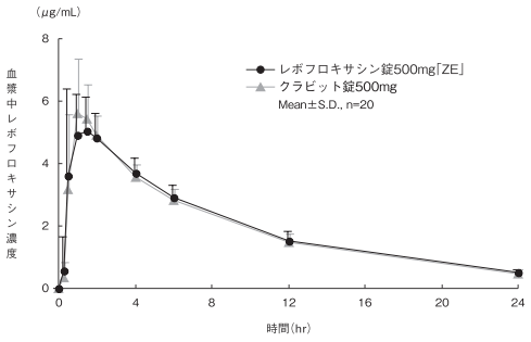 レボフロキサシン錠250mg「ZE」とクラビット錠250mgを、クロスオーバー法によりそれぞれ1錠(レボフロキサシンとして250mg)健康成人男子に絶食単回経口投与して血漿中未変化体濃度を測定し、得られた薬物動態パラメータ(AUC、Cmax)について90%信頼区間法にて統計解析を行った結果、log(0.80)~log(1.25)の範囲内であり、両剤の生物学的同等性が確認された7)。